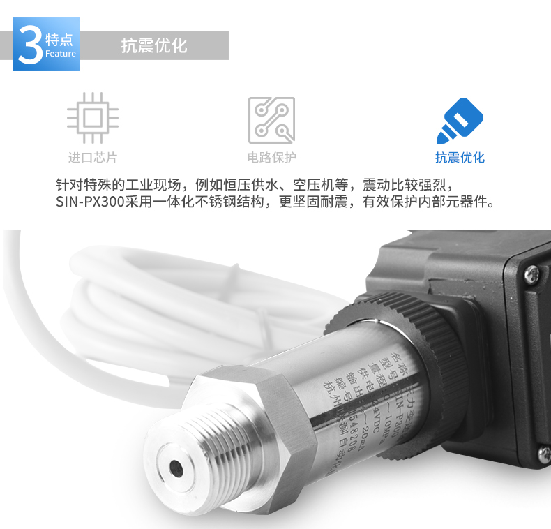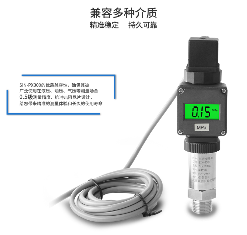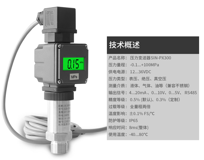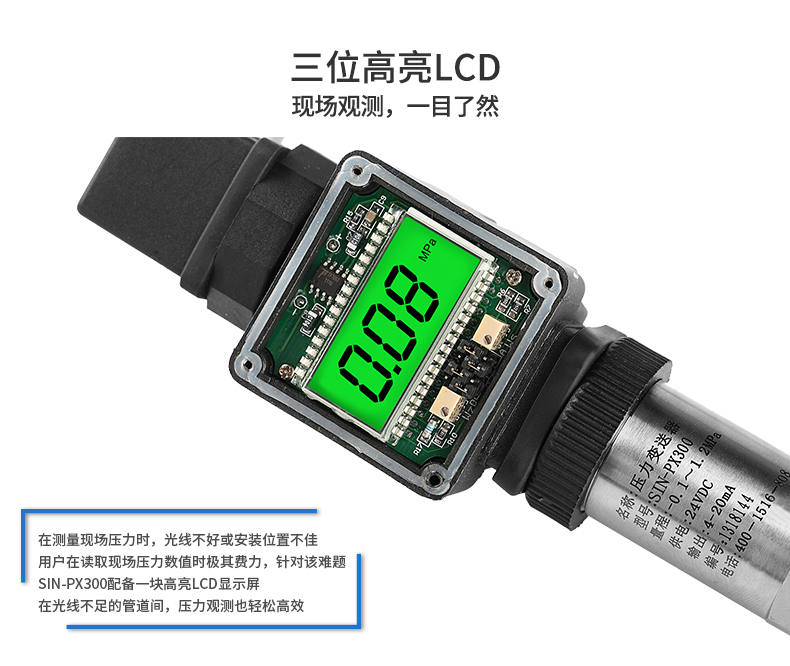 SIN-PX300型數顯壓力變送器采用無縫焊接結構,可批量化生產,經濟、可靠,具有良好的適應性,可應用于各種復雜的環境,該產品輸出形式多樣,壓力接口可提供定制,滿足您的使用需求。同時數顯壓力變送器帶有現場顯示功能,能夠更加直觀的顯示現場的壓力波動情況。廣泛應用于工業自動化設備配套以及石油、化工、冶金、電力等控制領域。